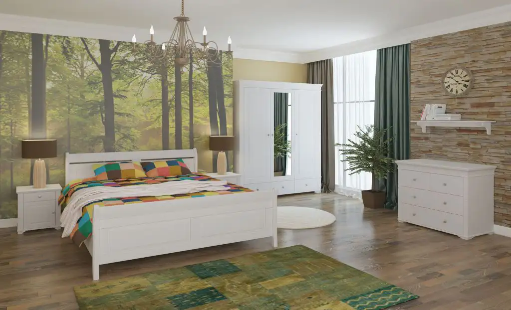 Коллекция мебели «Бейли» для спальни и гостиной включает в себя шкафы, кровати, диваны, стеллажи, витрины, тумбы, настенные полки, антресоли и другие предметы из массива сосны. Предметы предлагаются в 3 цветовых вариантах: белый воск, белый воск/антрацит и белый воск/антик.