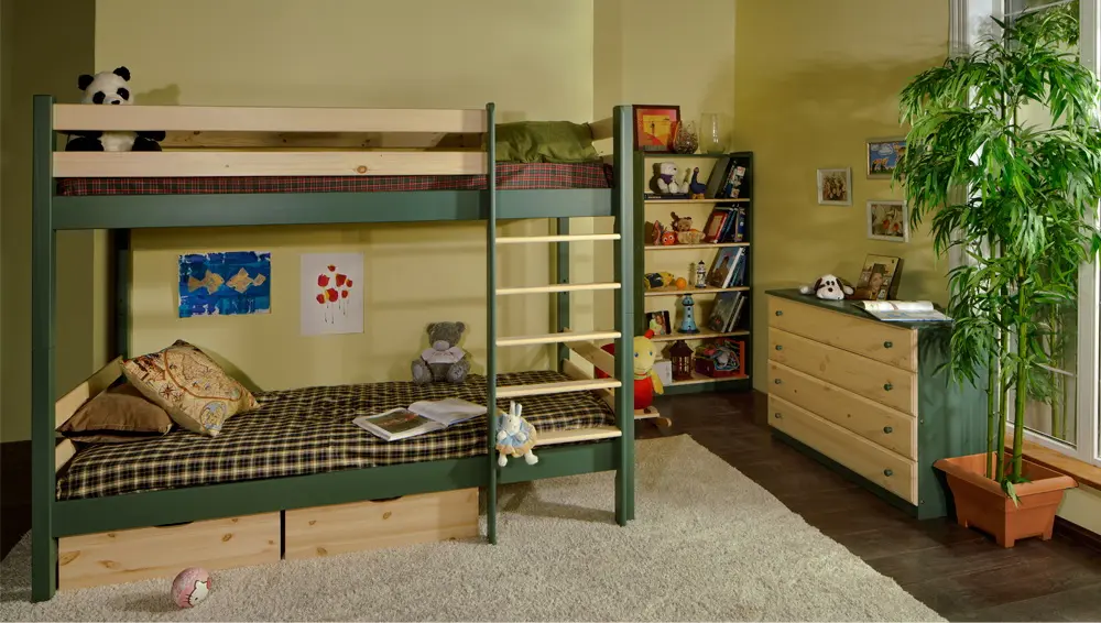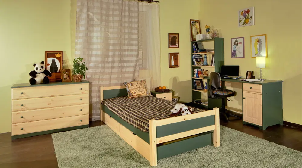 Материал - сосна, задняя стенка, дно ящиков - ДВП белого цвета.