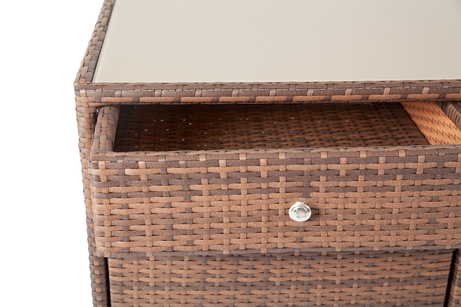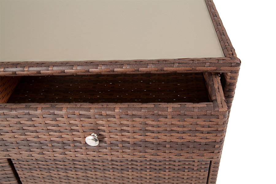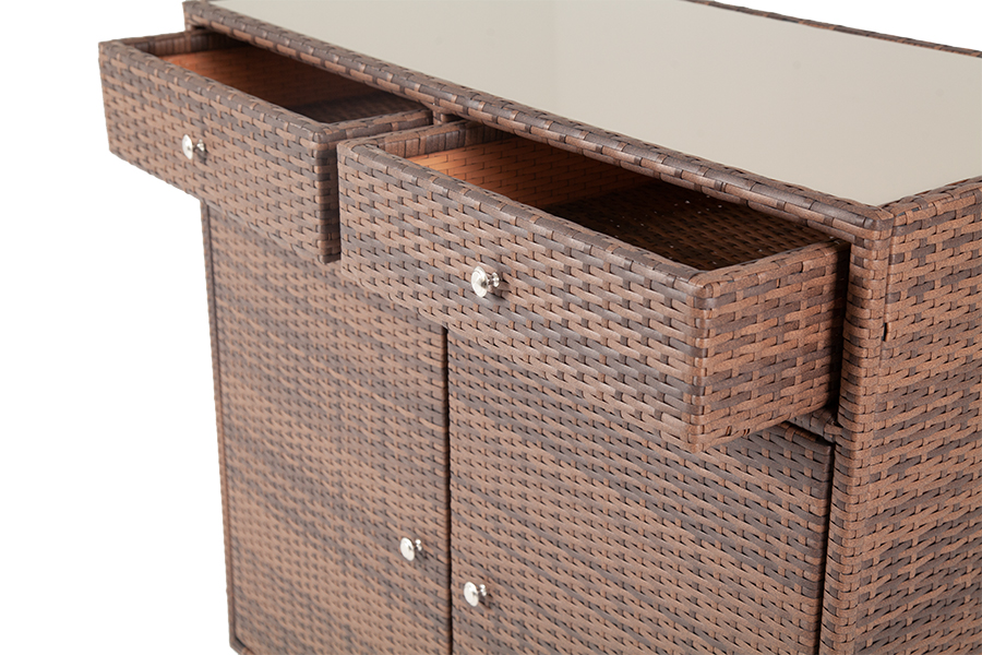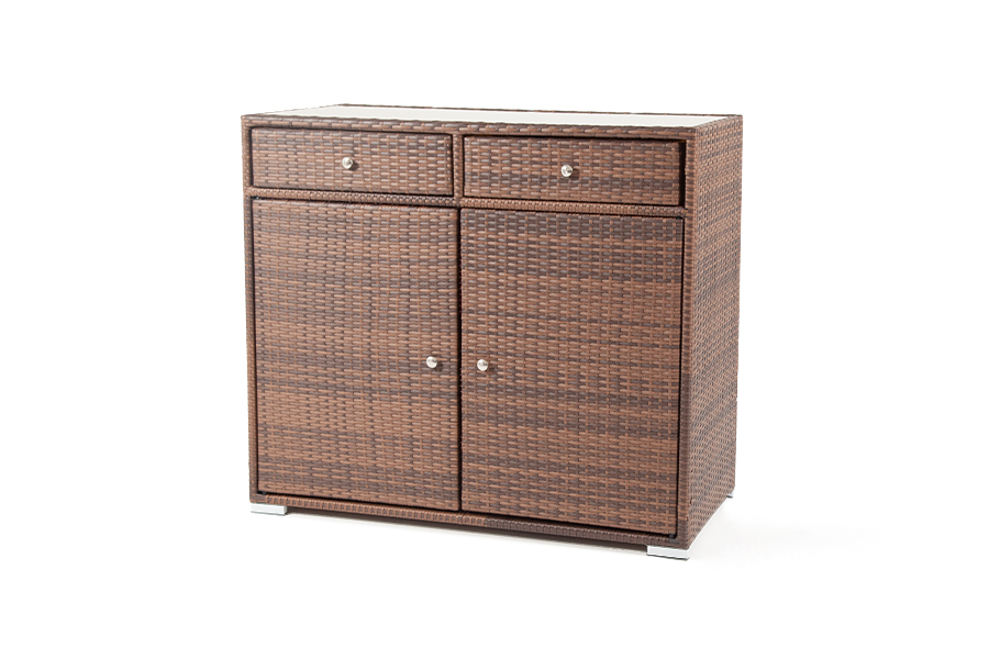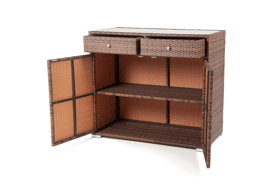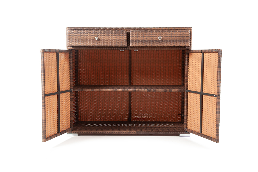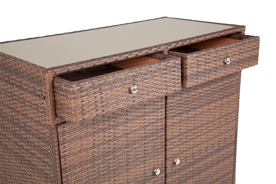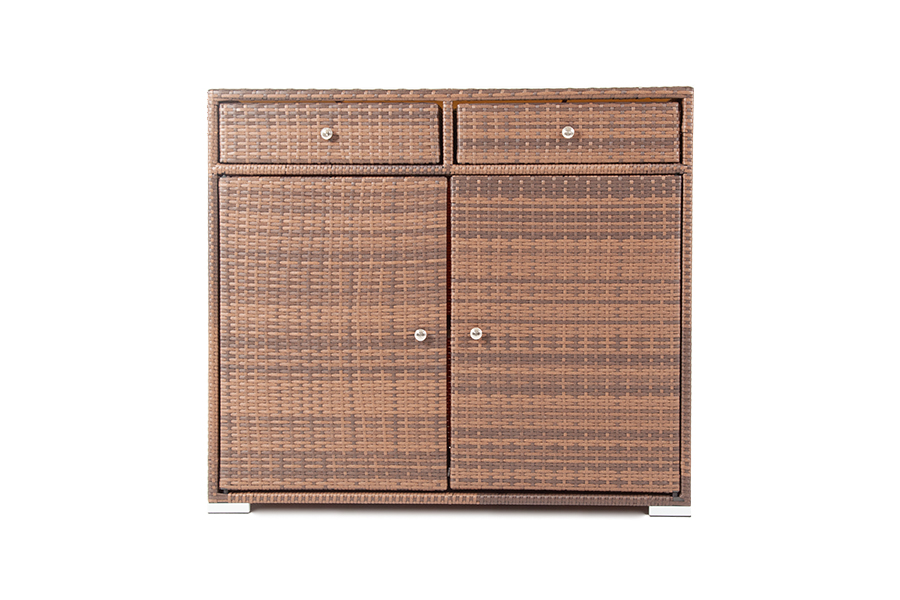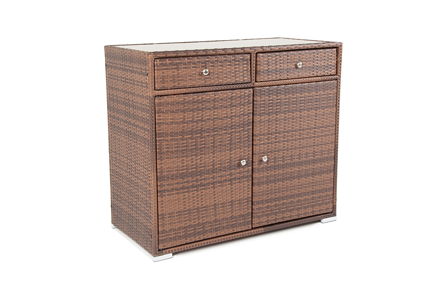 "Мальта" тумба изготовлена из алюминиевого каркаса, оплетенного плоским искусственным ротангом коричневого цвета. Размер - 1160×560×1020 мм. Тумба оснащена двумя выдвижными ящиками и двумя полками внутри. Закрывается на распашные дверцы.