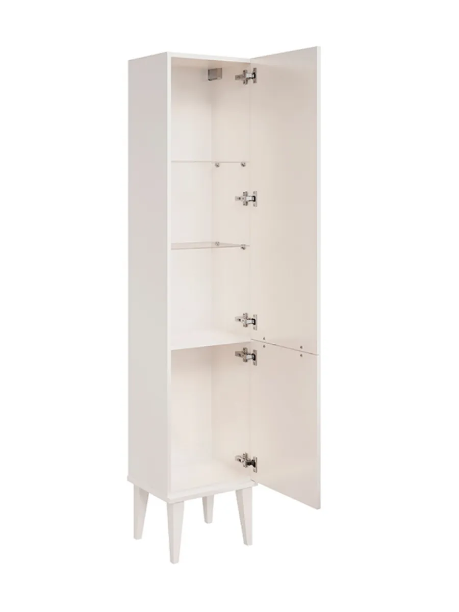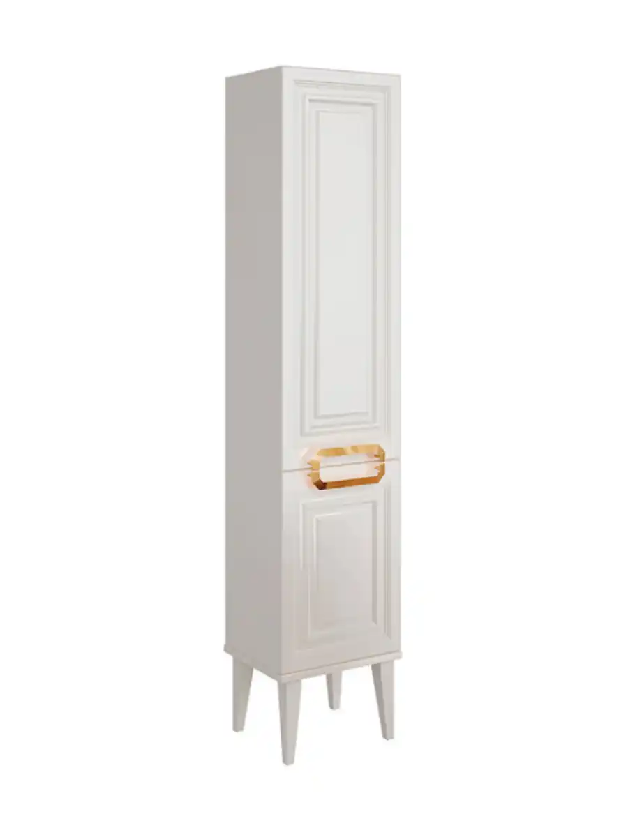 Узкий пенал высотой 190 см (40,8 × 32 см) из влагостойкого МДФ с белоснежной эмалью и благородными золотистыми ручками —