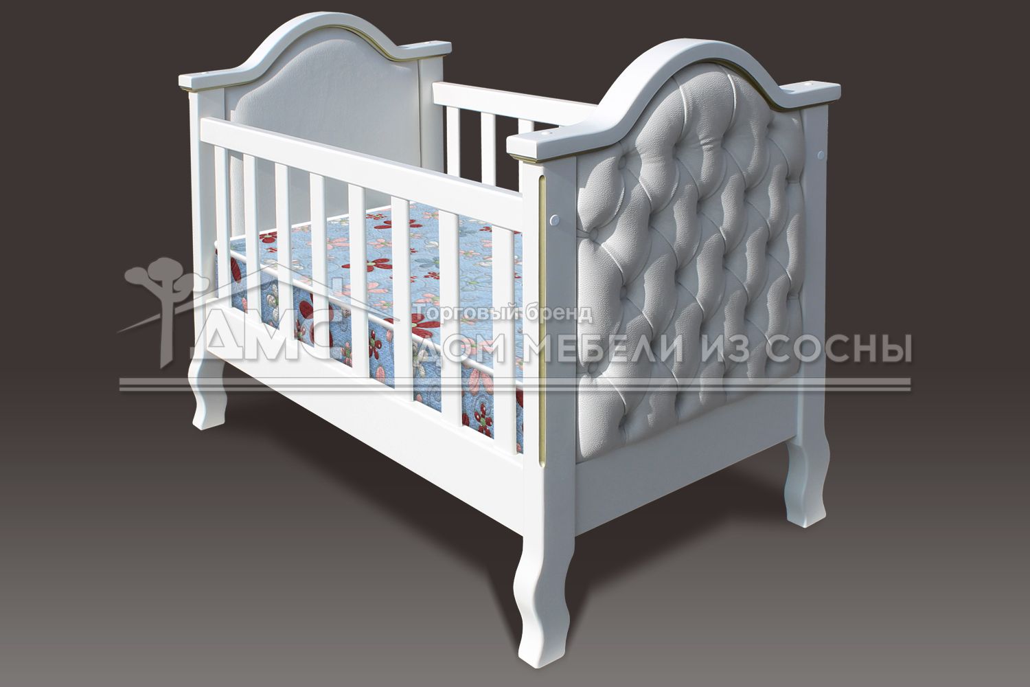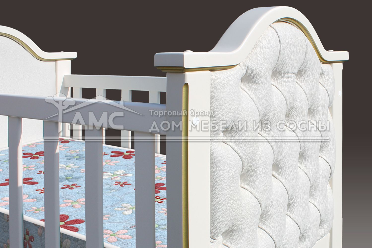 Дизайн кровати «Малютка» выполнен в утончённом стиле. В качестве декора используется каретная стяжка, которая придаёт модели изысканный вид. Такая кровать отлично впишется в классический интерьер детской комнаты.