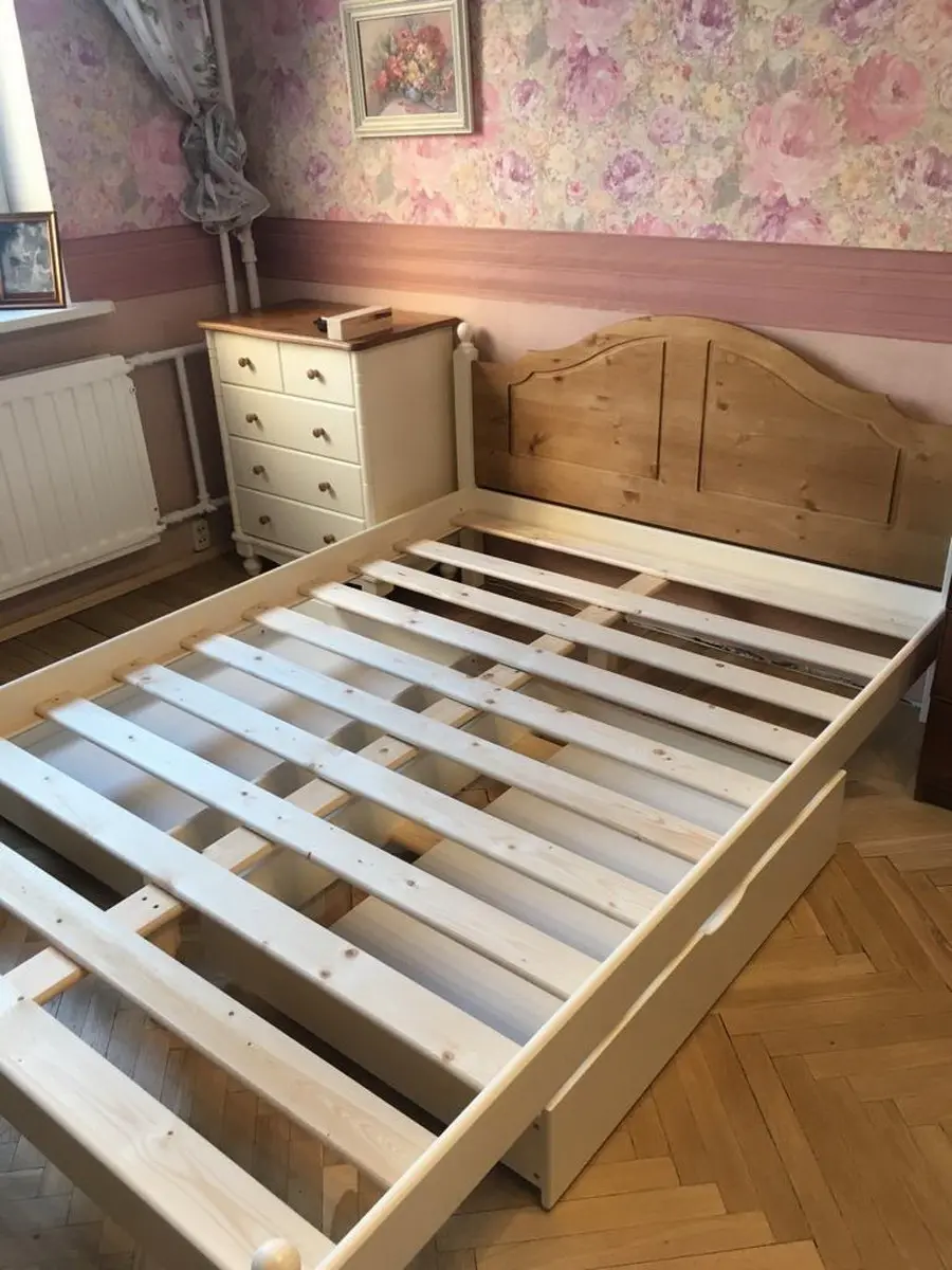 Кровать К1 деревянная доступна в трех вариантах цифрового решения: отделка прозрачным лаком, сохраняющим естественный цвет древесины; отделка светло-янтарным лаком, наполняющим комнату светом и теплом; отделка изысканным белым лаком. Такое многообразие вариантов позволяет удачно вписать кровать К1 в интерьер любой спальни. Дополнительными украшениями служат шарообразные навершия в углах кровати.