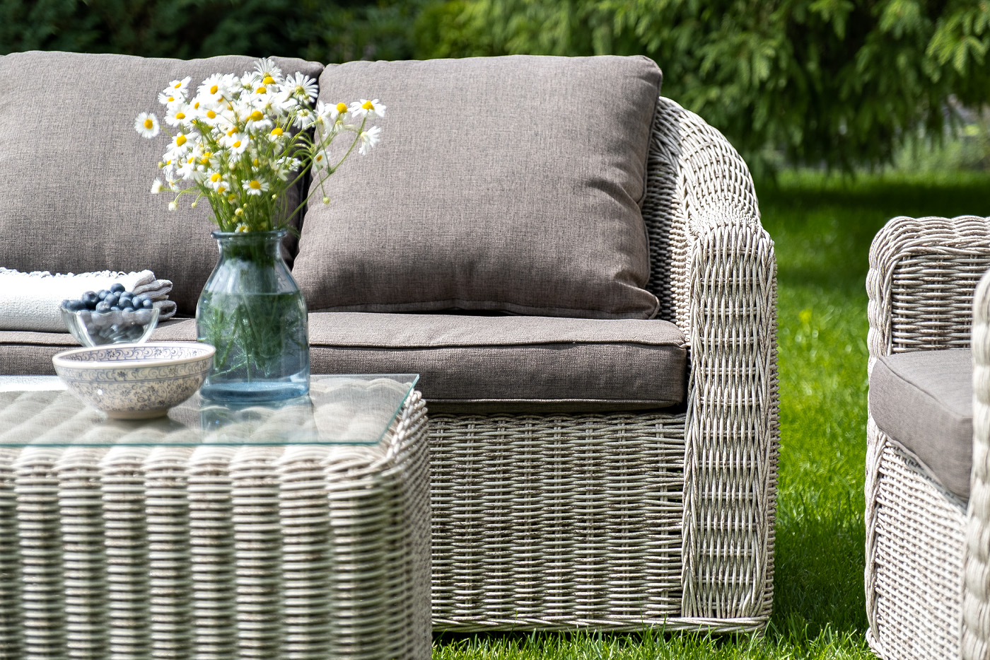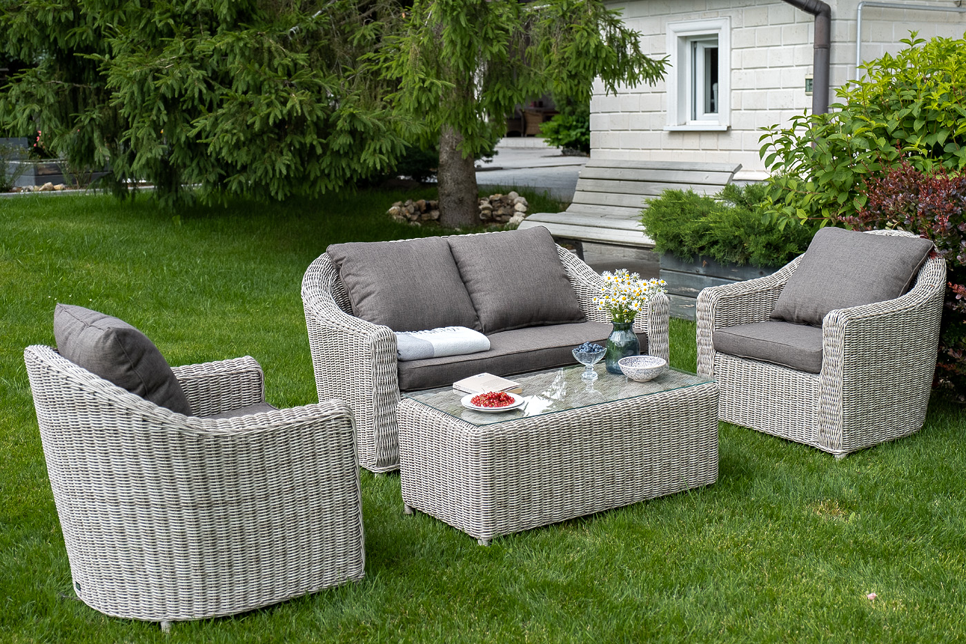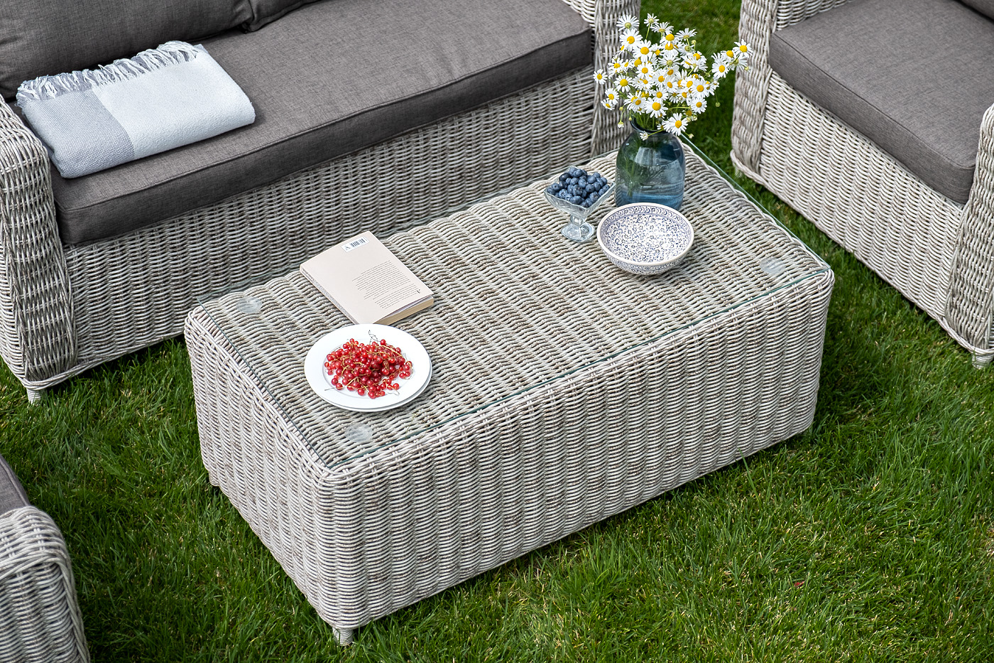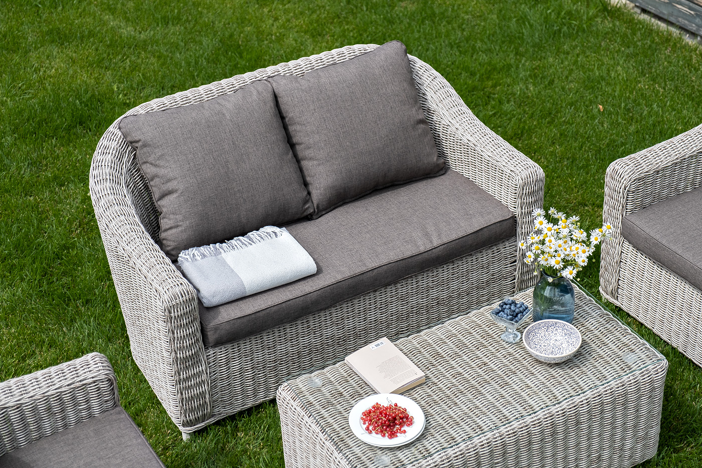 Лаунж-зона "Кон Панна" компактный комплект, рассчитанный на 4 персоны. В ее состав входят: - два плетеных кресла – 800×800×800 мм - двухместный диван – 1370×800×800 мм - журнальный столик – 1000×500×420 мм Садовая мебель выполнена из алюминиевого каркаса, выдерживающего большие нагрузки, и круглого искусственного ротанга. Каркас оплетен с помощью ручного метода и представлен в бежевом цвете. Диван и кресла укомплектованы удобными подушками в серо-коричневых чехлах. Они пошиты из материала с влагоотталкивающей пропиткой – полиэстера, плотностью 230гр/м2. Чехлы съемные, их можно стирать в стиральной машине. Журнальный столик дополняет рабочая поверхность из прочного стекла, толщина – 5 мм. "Кон Панна" диван из искусственного ротанга двухместный, цвет бежевый 1шт. 1 370Х800Х800, "Кон Панна" кресло из искусственного ротанга, цвет бежевый 2шт. 800Х800Х800, "Кон Панна" столик журнальный из искусственного ротанга, цвет бежевый 1шт. 1 000Х500Х420,
