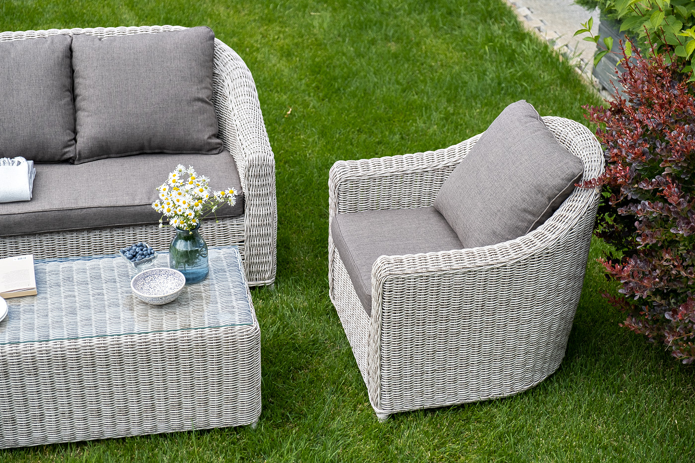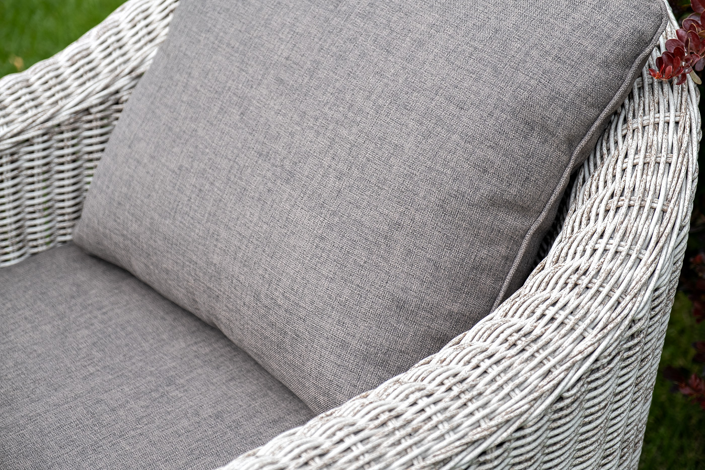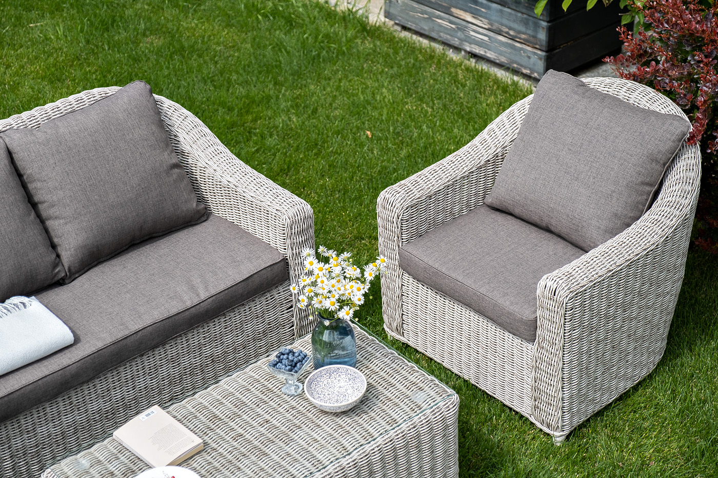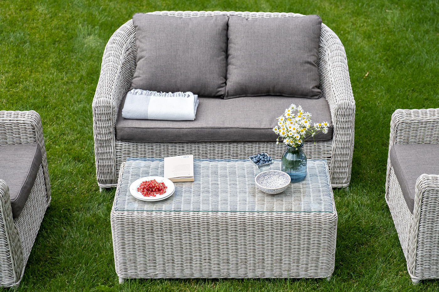 Лаунж-зона "Кон Панна" компактный комплект, рассчитанный на 4 персоны. В ее состав входят: - два плетеных кресла – 800×800×800 мм - двухместный диван – 1370×800×800 мм - журнальный столик – 1000×500×420 мм Садовая мебель выполнена из алюминиевого каркаса, выдерживающего большие нагрузки, и круглого искусственного ротанга. Каркас оплетен с помощью ручного метода и представлен в бежевом цвете. Диван и кресла укомплектованы удобными подушками в серо-коричневых чехлах. Они пошиты из материала с влагоотталкивающей пропиткой – полиэстера, плотностью 230гр/м2. Чехлы съемные, их можно стирать в стиральной машине. Журнальный столик дополняет рабочая поверхность из прочного стекла, толщина – 5 мм. "Кон Панна" диван из искусственного ротанга двухместный, цвет бежевый 1шт. 1 370Х800Х800, "Кон Панна" кресло из искусственного ротанга, цвет бежевый 2шт. 800Х800Х800, "Кон Панна" столик журнальный из искусственного ротанга, цвет бежевый 1шт. 1 000Х500Х420,