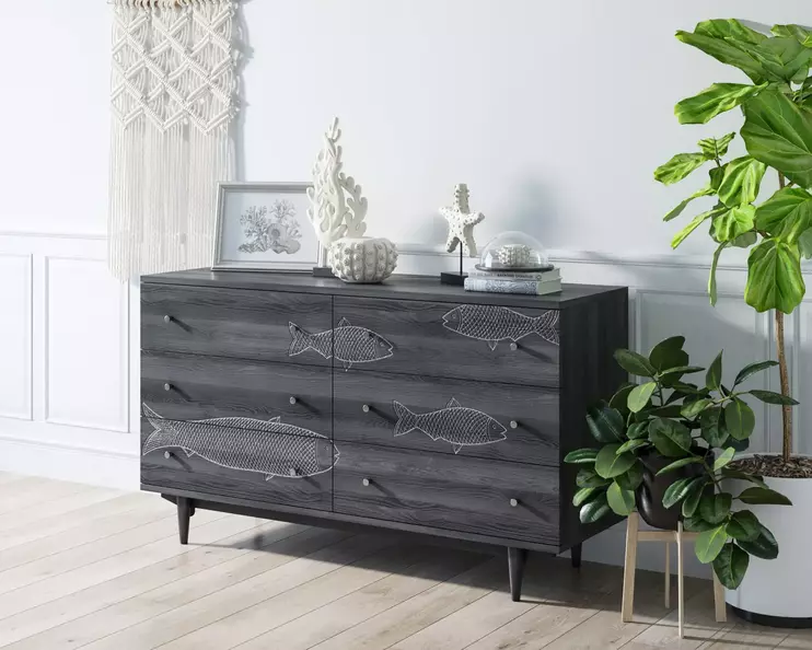 Мебель стандартно предлагается в 2 цветах, коричневом и черном. Возможность окрашивания в другие цвета по RAL рекомендуем уточнять при заказе. Фасады украшаются оригинальными фрезерованными рисунками: рыбы или растения. Металлические ручки-кнопки практически не видны на фасадах.