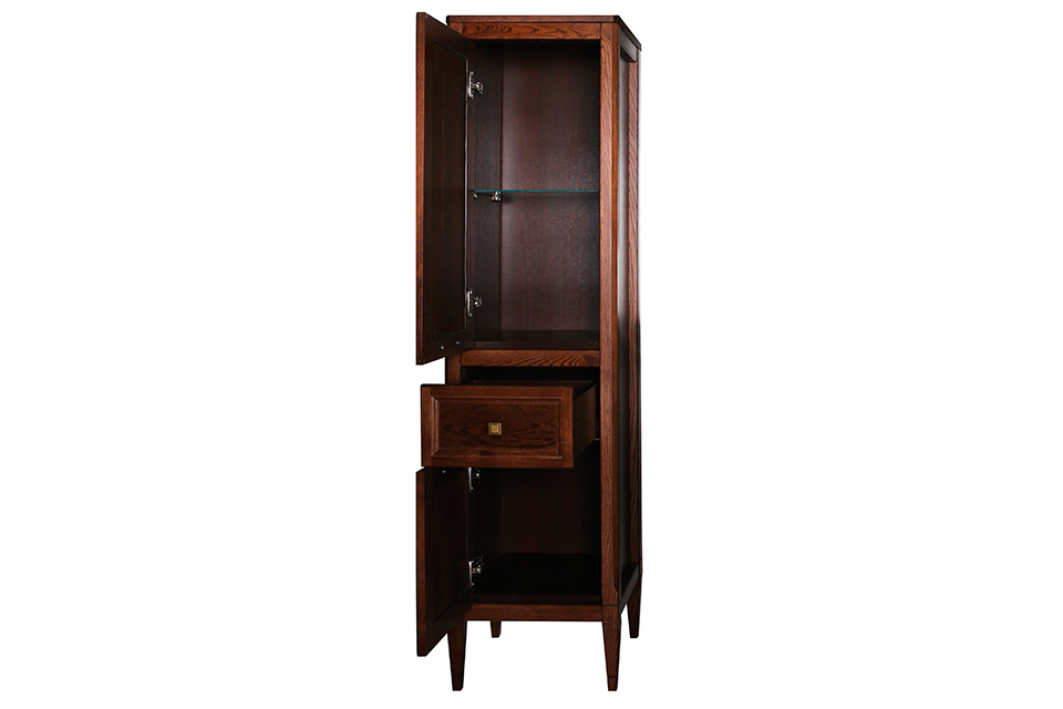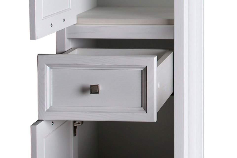Мы предлагаем раковины и тумбы разного размера, шкафы с правым или левым расположением петель. Дверцы и ящики оснащены европейской фурнитурой, открываются и выдвигаются плавно, без хлопков. Корпуса и фасады сделаны из натурального дерева (массив ясеня) и покрыты матовым лаком. Стенки ящиков сделаны из МДФ. На ручки нанесено стойкое матовое покрытие с эффектом состаривания.
