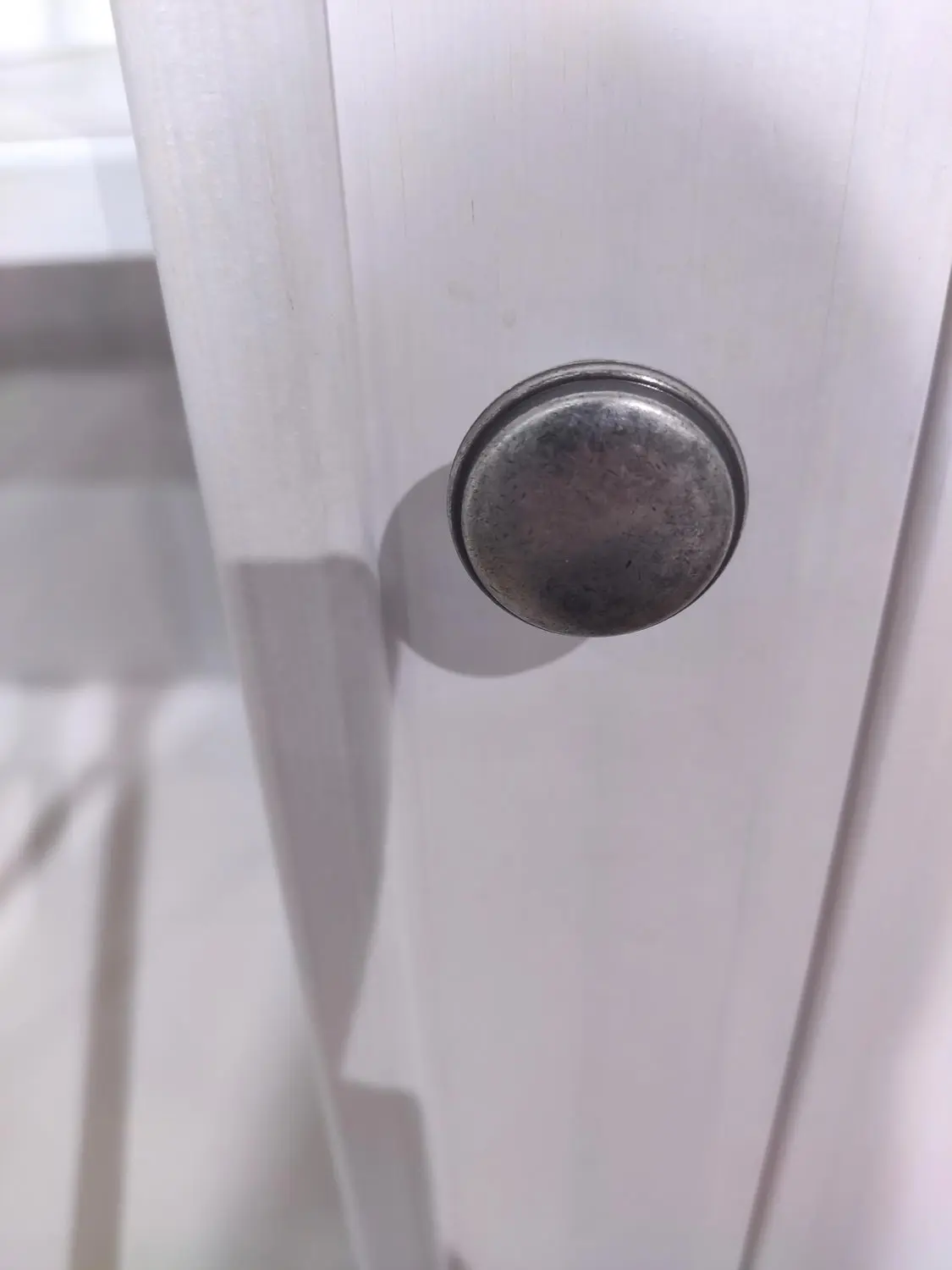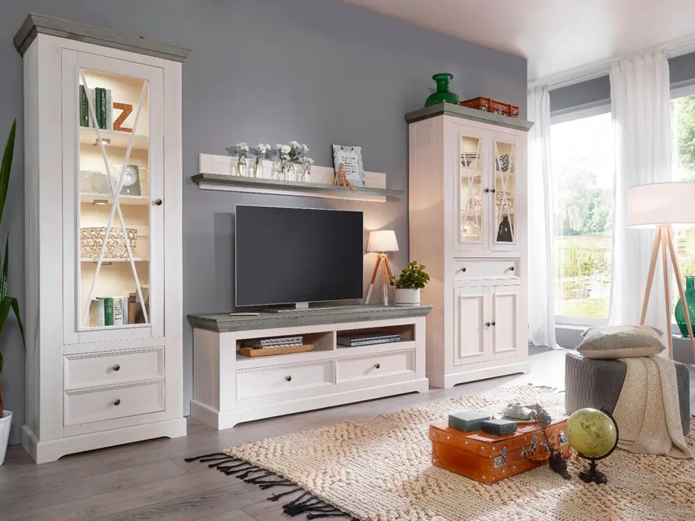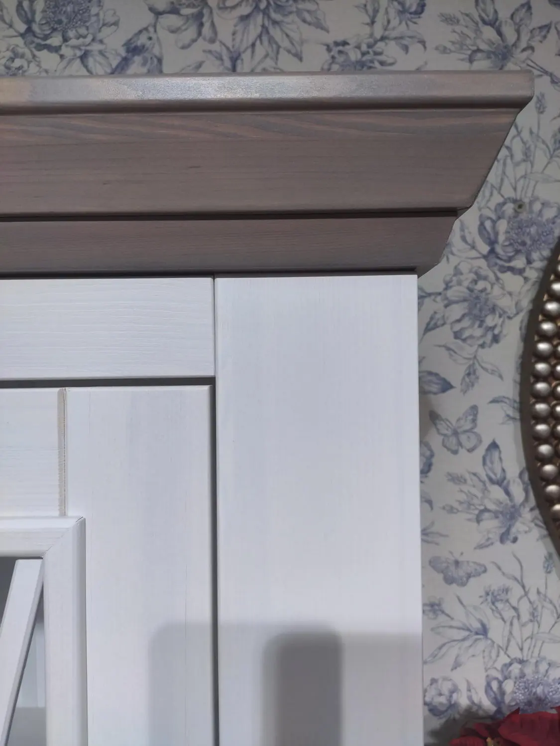Шкаф для посуды поставляется в цвете – «белый воск/серый (антрацит)». Комбинация цвета подразумевает отделку столешницы комода в цвет «антрацит» (серый), остальная часть изделия в цвете «белый воск». Структура дерева слегка просвечивает.