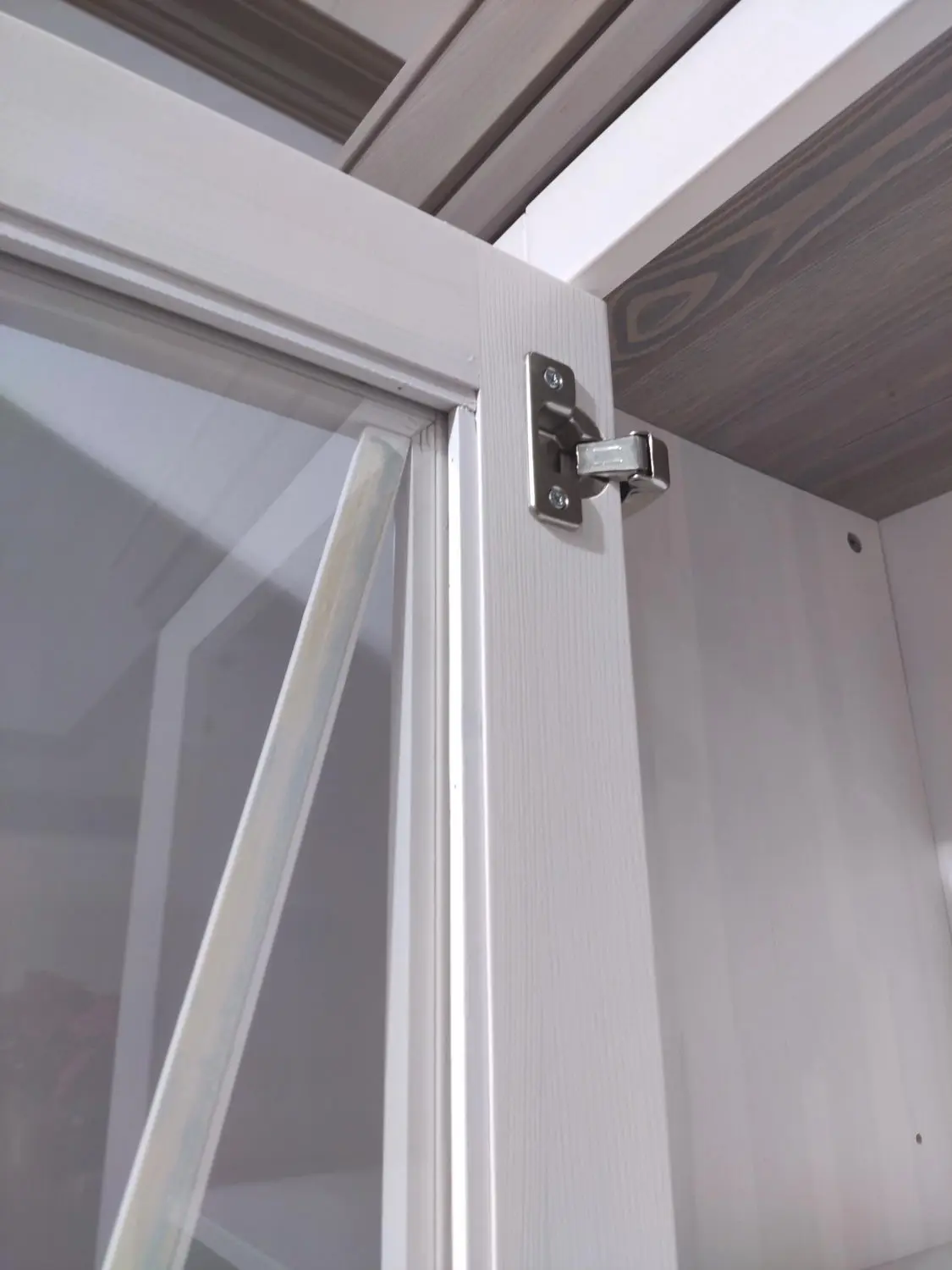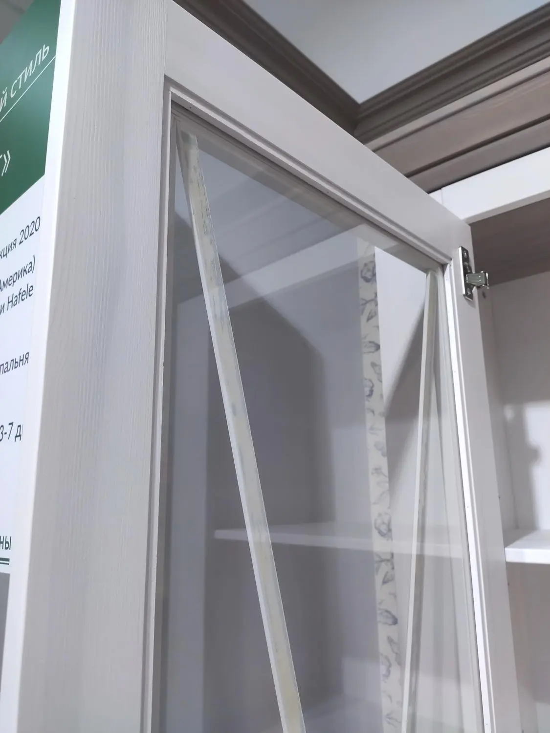 В верхней части шкафа за дверкой со стеклом, находиться 4 полки. В нижней части шкафа 2 выдвижных ящика. Дверь навешивается на любую сторону. Полки в шкафу можно переставлять по высоте. Ящики на роликовых направляющих от крупнейшей немецкой компании Hafele.